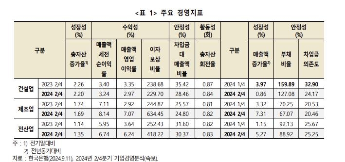 올해 2분기 국내 기업들의 수익성과 성장성 지표가 전반적으로 개선됐지만, 건설업은 매출 증가율 1% 미만까지 줄어드는 등 지표가 악화되고 있습니다.