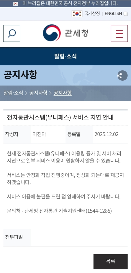 관세청은 2일 홈페이지에 안내문을 올려 "현재 유니패스 이용량 증가 및 서버 처리 지연으로 일부 서비스 이용이 원활하지 않을 수 있다"고 밝혔습니다.