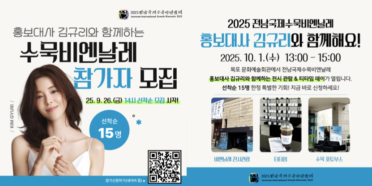 2025 전남국제수묵비엔날레 홍보대사 김규리와 함께하는 특별 프로그램 '전시관람&티타임'이 10월 1일 목포 문화예술회관에서 진행됩니다.