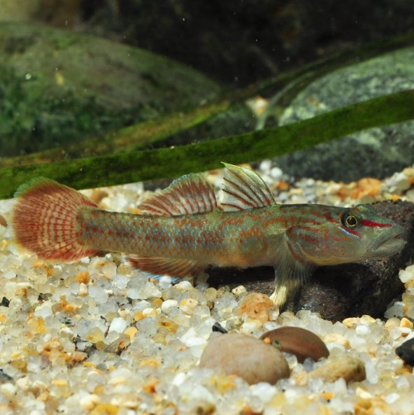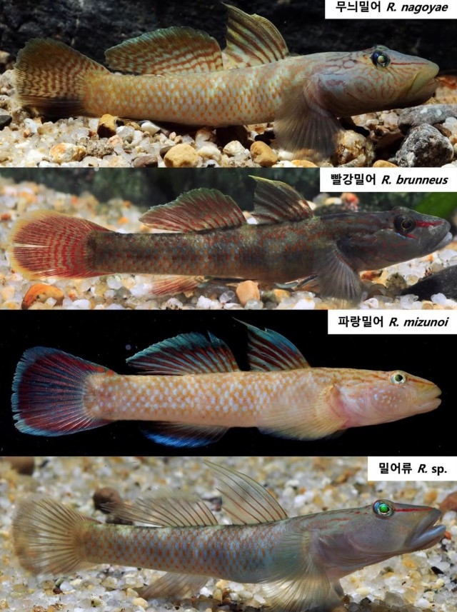 일반적인 밀어와 달리 눈앞에서 코끝까지 두꺼운 빨간 줄무늬가 있는 개체가 관찰돼 시민과학자들과 함께 형태와 유전자를 분석했고, 이 물고기는 일본에 서식하는 것으로 알려진 빨강밀어(Rhinogobius brunneus)임을 확인했습니다.
