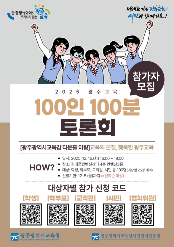 광주광역시교육청시민협치진흥원은 다음 달 16일 김대중컨벤션센터 4층 컨벤션홀에서 '2025 광주교육 100인 100분 토론회'를 개최합니다.
