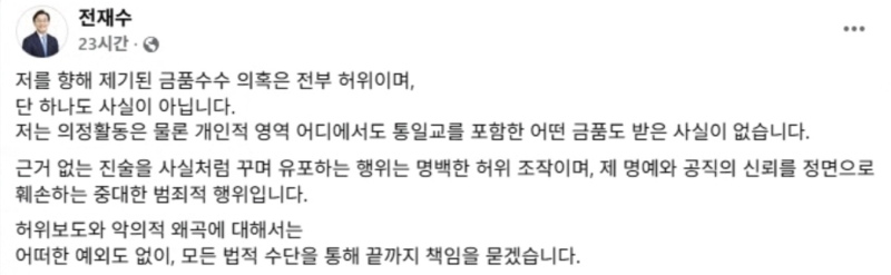 이와 관련해 당사자로 거론된 전재수 해양수산부 장관은 이날 페이스북을 통해 "저를 향해 제기된 금품수수 의혹은 전부 허위"라며 의혹을 부인했습니다.