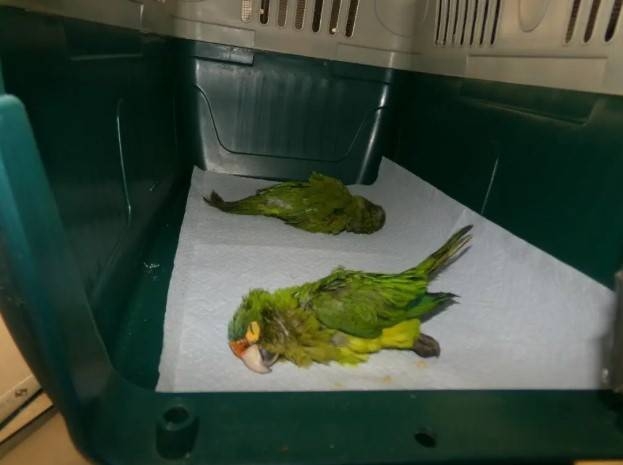 이 새들의 정체는 '오렌지이마앵무(Eupsittula canicularis)'로, 마취 상태에서 호흡만 가까스로 유지하고 있는 위급한 상태였습니다.