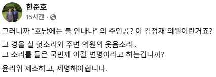 이에 대해 민주당 한준호 최고위원은 SNS를 통해 "'호남에는 불 안 나나'라는 경을 칠 헛소리 주인공이 김정재 의원이라는 말이냐"라며 "이걸 변명이라고 하냐, 윤리위에 제소하고 제명해야 한다"며 김 의원 해명을 강하게 비판했습니다.