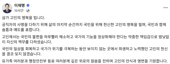 앞서 이재명 대통령도 3일 페이스북을 통해 "공직자의 사명을 다하기 위해 삶의 마지막 순간까지 국민을 위해 헌신한 고인의 명복을 빌며, 국민과 함께 슬픔과 애도를 표한다"라고 밝혔습니다.