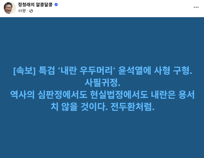 정청래 대표는 이날 페이스북에 "사필귀정"이라며 "역사의 심판정에서도 현실 법정에서도 내란은 용서치 않을 것이다. 전두환처럼"이라고 썼습니다.