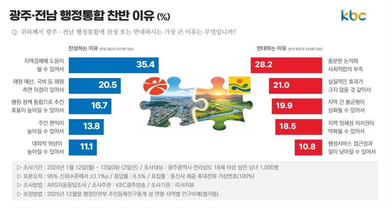 '광주·전남 행정통합' 찬성, 반대 보다 두 배 높다...경제적 효과 기대[KBC 여론조사]