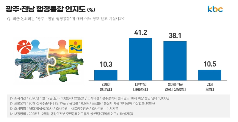 한편 광주·전남 행정통합에 대한 인지도 조사에서는 대략적인 내용을 알고 있다는 응답이 41.2%로 가장 많았고, 들어본 적은 있으나 잘 모른다는 응답이 38.1%로 뒤를 이었습니다.