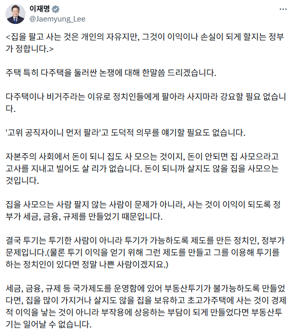 이날 3박 4일간의 싱가포르·필리핀 순방길에 오른 이 대통령은 싱가포르 도착 후 현지에서 엑스(X·옛 트위터)를 통해 "주택, 특히 다주택을 둘러싼 논쟁에 대해 한 말씀 드리겠다"면서 이같이 적었습니다.