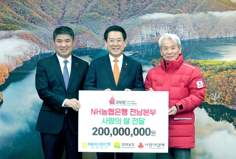 NH농협은행 전남본부는 3일 오후 전남도청 VIP실에서 10kg 쌀 8천 가마, 싯가 2억 원 상당을 겨울철 취약계층의 월동 지원을 위해 사용해 달라며 전남사회복지공동모금회에 전달했습니다.