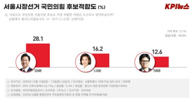 국민의힘 서울시장 적합도 조사 결과, 오세훈 현 시장이 가장 높은 지지율을 기록했습니다. KPI뉴스가 리서치뷰에 의뢰해 지난 12일과 13일 서울 지역 유권자 1,000명을 대상으로 실시한 여론조사 결과입니다. 국민의힘 서울시장 후보 적합도를 묻는 말에 응답자의 28.1%가 오세훈 현 시장을 가장 적합하다고 응답했습니다. 나경원 의원이 16.2%, 한동훈 전 대표가 12.6%의 적합도를 얻었습니다. 오 시장은 특히 70대 이상에서 39.4%로 가장 높은 지지를 받았으며, 50대를 제외한 전 연령대에서 나 의원과 한 전 대표를