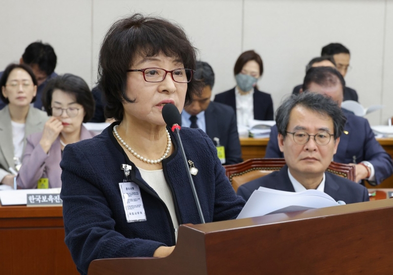 ▲ 지난 10월 16일 서울 여의도 국회 교육위원회에서 열린 2025년도 교육부 산하 기관에 대한 국정감사에서 박지향 동북아역사재단 이사장이 업무 보고를 하고 있다 [연합뉴스]