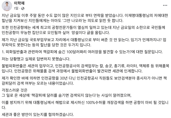 이학재 사장은 어제 자신의 SNS에 "불법외화 반출은 세관의 업무이고, 인천공항공사의 검색 업무는 칼, 송곳, 총기류, 라이터, 액체류 등 위해 품목"이라며 "제가 확인한 바에 의하면, 인천공항을 30년 다닌 인천공항공사 직원들도 보안 검색 분야 종사자가 아니면 '책갈피 달러' 검색 여부는 모르는 내용이었다"라고 억울해 했습니다.