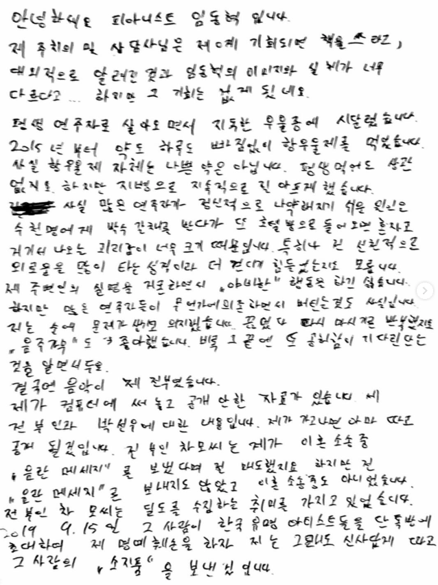 앞서 임씨는 이날 오전 7시 34분쯤 인스타그램에 "평생 연주자로 살아오면서 지독한 우울증에 시달렸다"며 "그동안 여러분 덕분에 행복했고 감사했다"고 의미심장한 글을 올렸습니다.