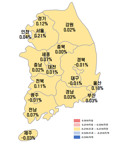 광주광역시는 전주에 이어 이번 주에도 0.01% 하락했습니다.