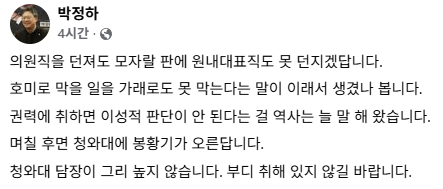 같은 당 박정하 의원 역시 페이스북을 통해 "의원직을 던져도 모자랄 판에 원내대표직도 유지하려 한다"며 "권력에 취하면 이성적 판단이 안 된다는 걸 보여주는 사례"라고 비난했습니다.