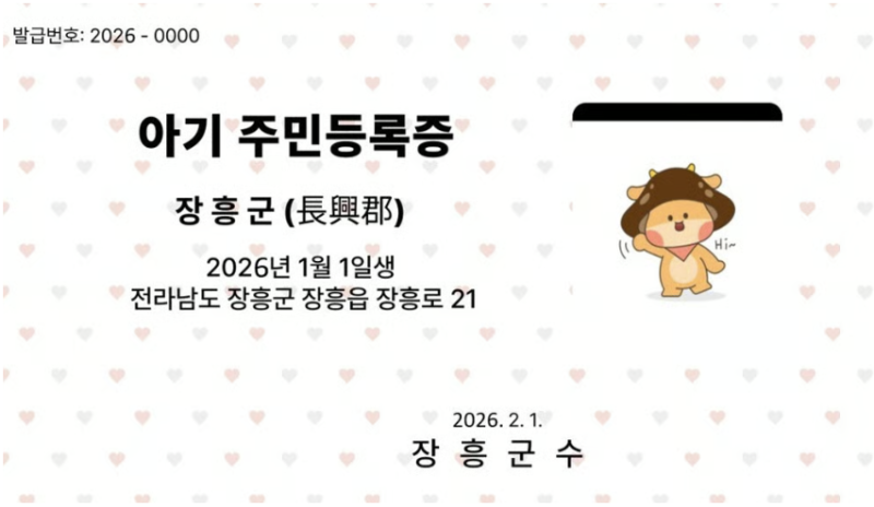 전남 장흥군이 새해부터 '아기 주민등록증' 무료로 발급해 줍니다.