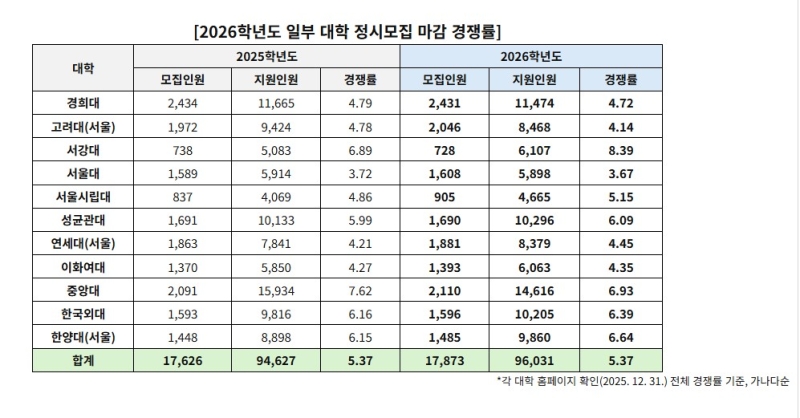 한편 서울 주요 11개 대학의 정시 경쟁률은 지난해와 같은 5.37대 1로 집계됐습니다.