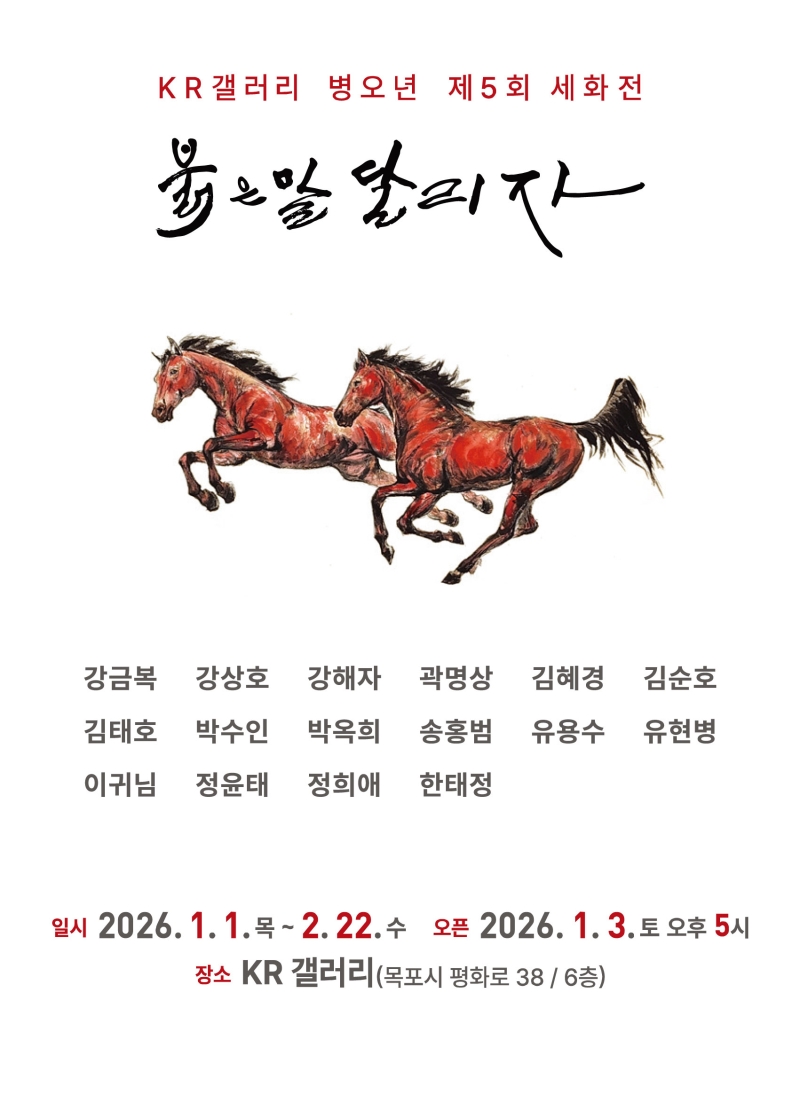 바다의 도시, 전남 목포에 위치한 KR갤러리(목포시 평화로 38 골든타워 6층)에서는 2월 20일까지 '붉은 말 달리자'라는 제목의 특별한 세화전을 만날 수 있습니다.