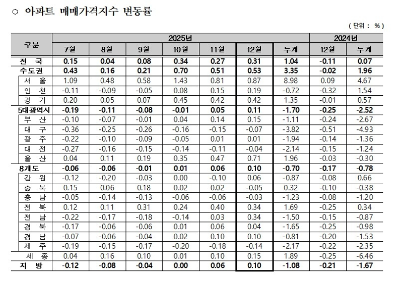 15일 한국부동산원이 발표한 '2025년 12월 전국 주택가격 동향조사' 결과에 따르면 지난해 서울 아파트 매매가격 누적 상승률은 8.98%로 나타났습니다.
