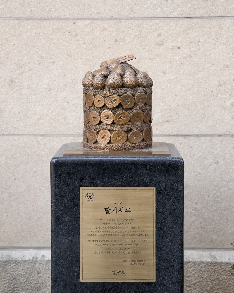대전의 대표 제과점 성심당이 창립 70주년을 맞아 인기 케이크 '딸기시루'를 기념하는 특별한 동상을 SNS를 통해 공개했습니다.