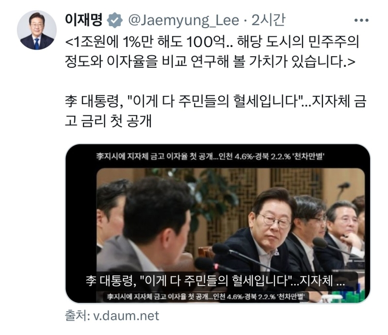이재명 대통령은 28일 자신의 엑스(X·옛 트위터) 계정을 통해 "이게 다 주민들의 혈세"라며 행정안전부의 첫 이자율 공개를 공유했습니다.