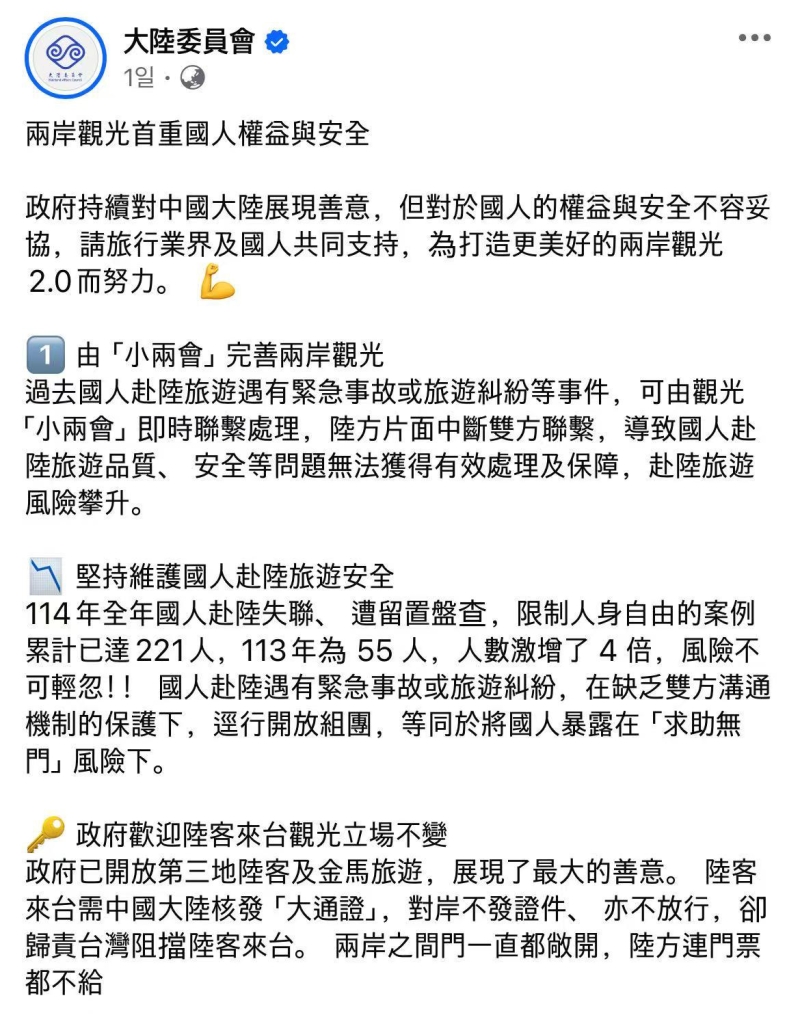 과거에는 대만인이 중국에서 긴급 사고나 관광 분쟁을 겪을 경우 관광 분야 협의기구를 통해 처리할 수 있었지만, 중국이 일방적으로 관련 연락 체계를 중단하면서 대만인의 중국 여행과 관련한 안전 문제를 효과적으로 보장하기 어려운 상황이라고 대륙위원회는 강조했습니다.