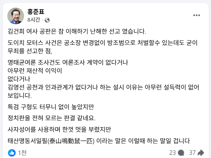 홍 전 시장은 "특검 구형도 터무니없이 높았지만 정치판을 전혀 모르는 판결 같다"며 "사자성어를 사용하며 한껏 멋을 부렸지만, 태산명동서일필(泰山鳴動鼠一匹)이라는 말은 이럴 때 하는 말일 것"이라고 덧붙였습니다.
