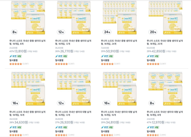 2일 쿠팡 판매 페이지를 보면 쿠팡 자체브랜드(PB) 자회사 씨피엘비(CPLB)의 '루나미' 생리대 제품 중 '루나미 소프트 중형 18개입' 8∼24팩 제품이 가격 인하 이틀 만에 동났습니다.