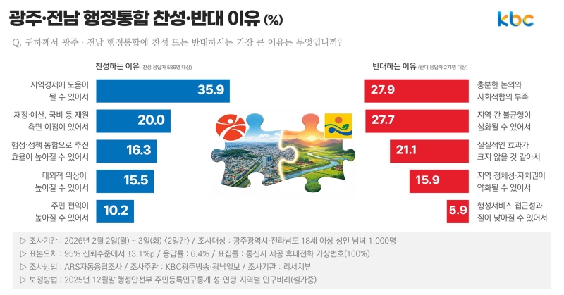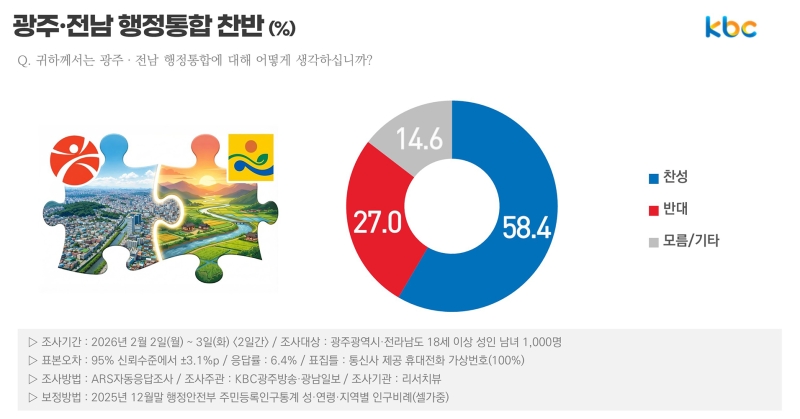 KBC광주방송이 여론조사 전문기관 리서치뷰에 의뢰해 지난 2~3일 광주·전남 만 18세 이상 성인 1,000명을 대상으로 조사한 결과, 행정 통합 찬성은 58.4%, 반대는 27.0%로 집계됐습니다.