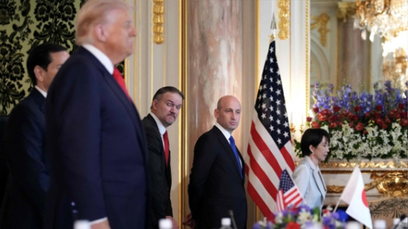 ▲ 미일 정상회담에서 트럼프 대통령 바라보는 스티븐 밀러 백악관 부비서실장 [연합뉴스]