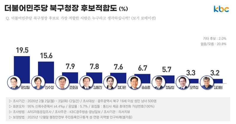 오는 6월 지방선거를 앞두고 실시된 광주광역시 북구청장 여론조사에서 문상필 더불어민주당 부대변인과 신수정 현 광주시의회 의장이 양강 구도를 보였습니다.