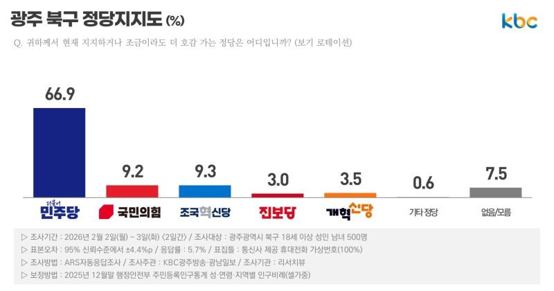 광주 북구 정당지지도는 △더불어민주당(66.9%) △조국혁신당(9.3%) △국민의힘(9.2%) △개혁신당(3.5%) △진보당(3.0%) 순입니다.더불어민주당은 △40대(72.8%) △60대(80.7%) △70대+(75.6%)에서 70~80%대의 높은 지지율 기록했습니다.