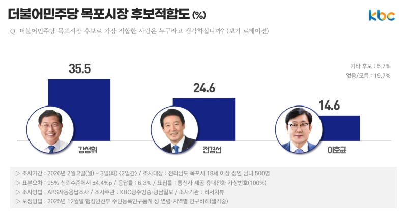 민주당 후보적합도 조사에서도 △강성휘 현 더불어민주당 정책위 부의장(35.5%) △전경선 현 전남도의원(24.6%) △이호균 현 목포과학대학교 총장(14.6%) 순으로 각 후보간의 격차는 오차범위 밖이었습니다.