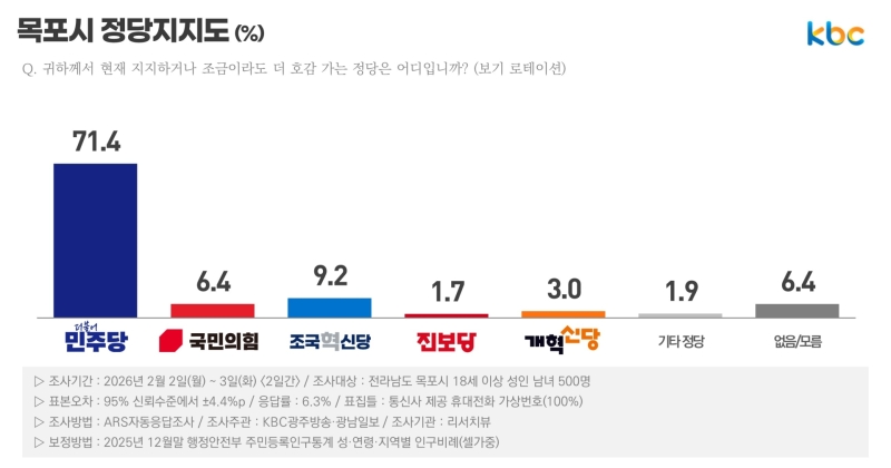 목포시 정당지지도는 △더불어민주당(71.4%) △조국혁신당(9.2%) △국민의힘(6.4%) △개혁신당(3.0%) △진보당(1.7%) 순이었습니다.