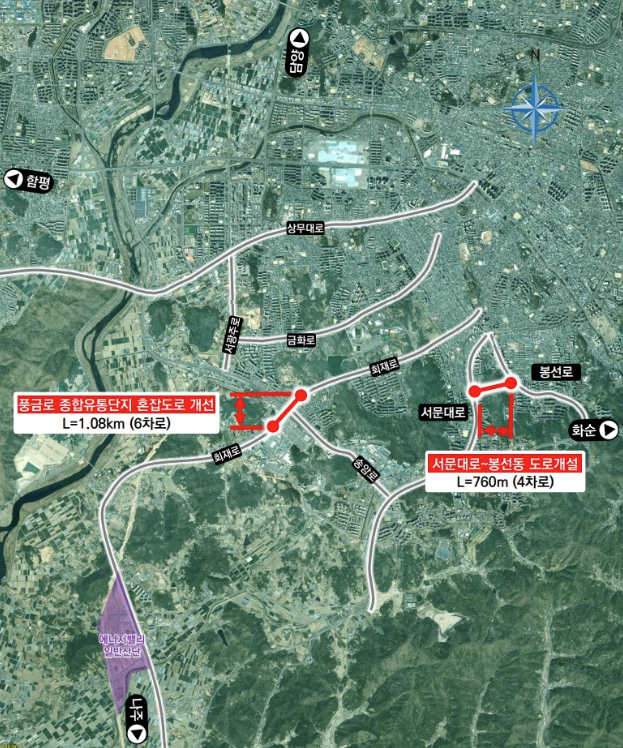'서문대로~봉선동 도로 개설'은 연장 0.8㎞(4차로) 구간을 새로 뚫는 사업입니다.