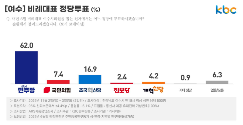 실제, 지난해 11월 여론조사에서 여수 내 민주당 지지율은 73.3%, 조국혁신당 8.7%로 압도적인 차이를 보였지만 6ㆍ3 지방선거 비례대표 투표에서 민주당에 투표하겠다는 응답은 62%에 머물렀고, 조국혁신당을 뽑겠다는 응답이 16.9%까지 올랐습니다.