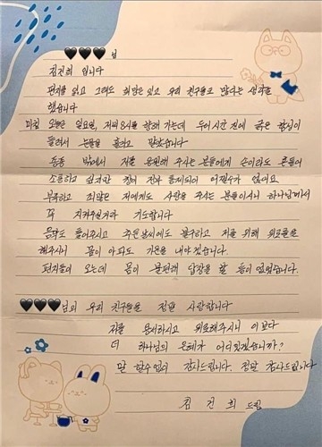 12일 법조계 등에 따르면 김 여사는 최근 한 지지자에게 보낸 편지에서 “김건희입니다. 편지를 읽고 그래도 희망은 있고 우리 친구들도 많다는 생각을 했습니다”라고 전했습니다.