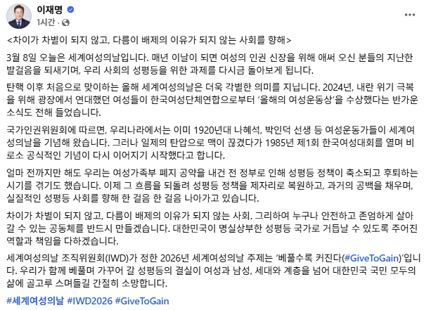 아울러 이 대통령은 "세계 여성의 날 조직위원회(IWD)는 2026년 세계 여성의 날 주제를 '베풀수록 커진다(#GiveToGain)'로 정했다"며 "우리가 함께 베풀며 가꿔 갈 성평등의 결실이 여성과 남성, 세대와 계층을 넘어 대한민국 국민 모두의 삶에 골고루 스며들길 간절히 소망한다"고 덧붙였다.