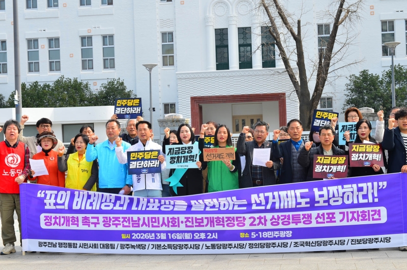 자치분권 행정통합 완성 및 정치개혁 촉구 광주전남 시민 대응팀은 16일 민주당이 지난 대선 국면에서 시민 앞에 약속한 선거제 개혁과 검찰 개혁, 내란 방지를 위한 개헌 추진을 철저히 외면하고 있다고 주장했습니다.