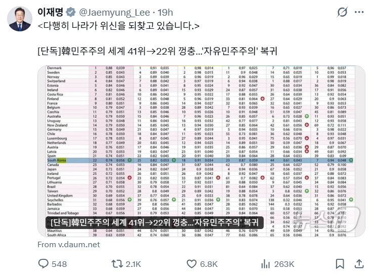 이재명 대통령은 18일 자신의 X를 통해 한국의 민주주의 지수가 세계 22위로 급등했다는 소식을 전하며 "다행히 나라가 위신을 되찾고 있습니다"라는 메시지를 남겼습니다.