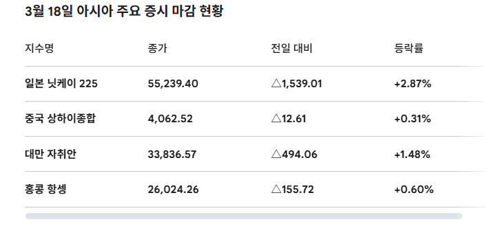 ▲ 3월 18일 아시아 주요 증시 마감 현황