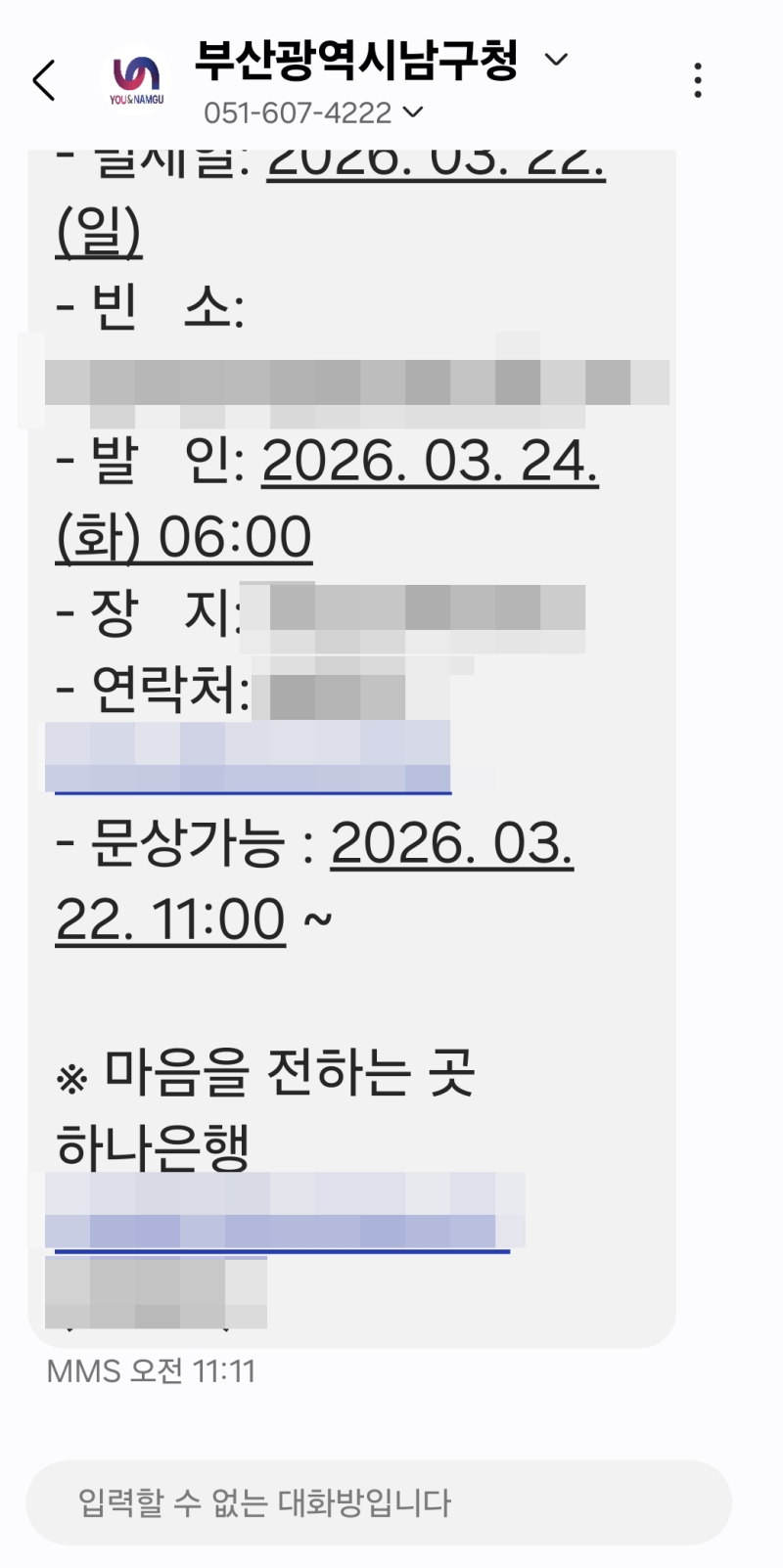 부산 남구청에서 공무원 가족의 부고 문자를 주민 수천 명에게 문자메시지로 발송하는 일이 벌어졌습니다.