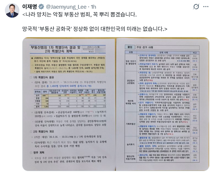 이재명 대통령이 24일 정부의 부동산 범죄 특별단속 성과를 직접 공개하며 "나라 망치는 악질 부동산 범죄, 꼭 뿌리 뽑겠다"고 강조했습니다.