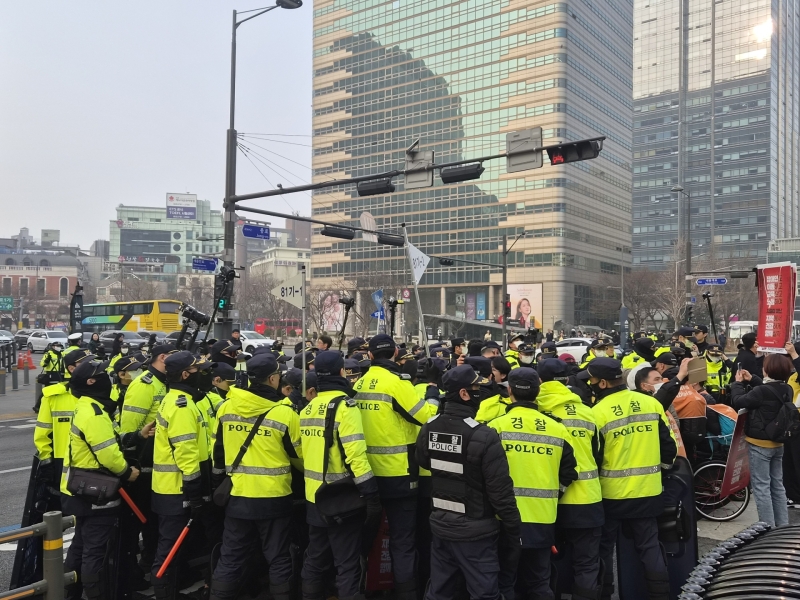 27일 경찰 등에 따르면 이날 아침 8시 10분쯤 전장연 소속 활동가 20여 명이 광화문역 사거리 세종대로 서대문 방향 버스정류장에서 휠체어를 탄 채 버스 탑승을 시도했습니다.