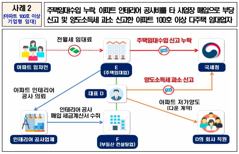 서울·경기 등지에 아파트 200여채를 보유한 B업자는 거래 상대방이 일반인이라는 점을 악용해 주택 40채에 대한 임대수입 약 8억 원을 신고하지 않은 혐의로 조사 선상에 올랐습니다.