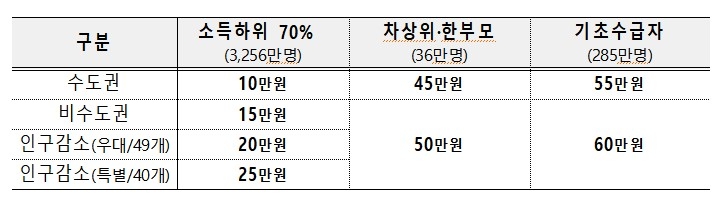 수도권 거주자는 10만 원을 받으며, 비수도권과 인구감소지역 거주자는 최대 25만 원까지 지원받습니다.