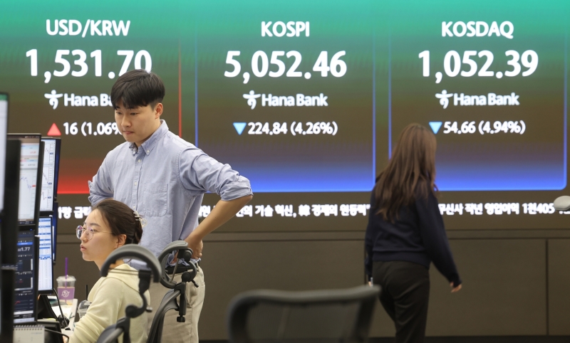 31일 코스피 지수는 전날보다 224.70포인트(4.26%) 내린 5,052.60으로 장을 마감했습니다.