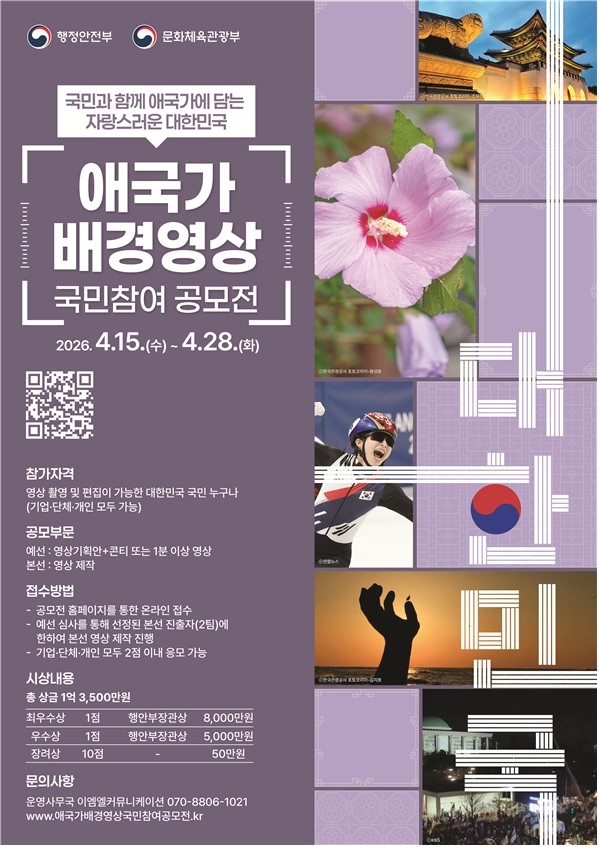 행정안전부는 문화체육관광부와 함께 '애국가 배경영상 국민 참여 공모전'을 연다고 6일 밝혔습니다.