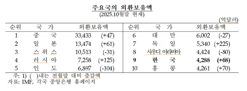 우리나라의 외환보유액 규모는 10월 말 기준(4,288억 달러)으로 세계 9위 수준이며, 중국이 3조 3,433억 달러로 가장 많았습니다.